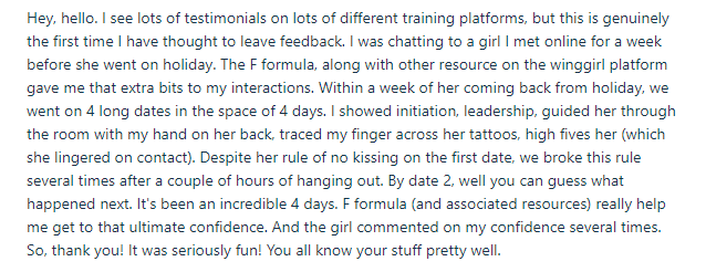 "I would just like to add a big THANK YOU for providing a manipulation free way to flirt and talk to women that will keep me out of the friend zone.