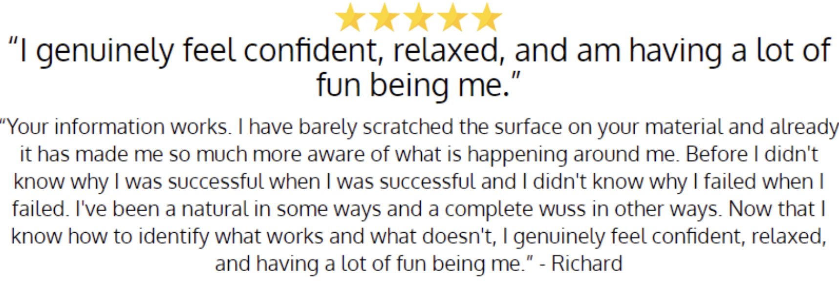"I freaking LOVE this guide. I've always been comfortable with the women around me, but I could never talk to the girls I really wanted. This guide has given me a road map that has changed my life in all directions! In the past 2 weeks, I've made more friends, been invited to partys, deepened existing relationships, and just felt so much better about myself.